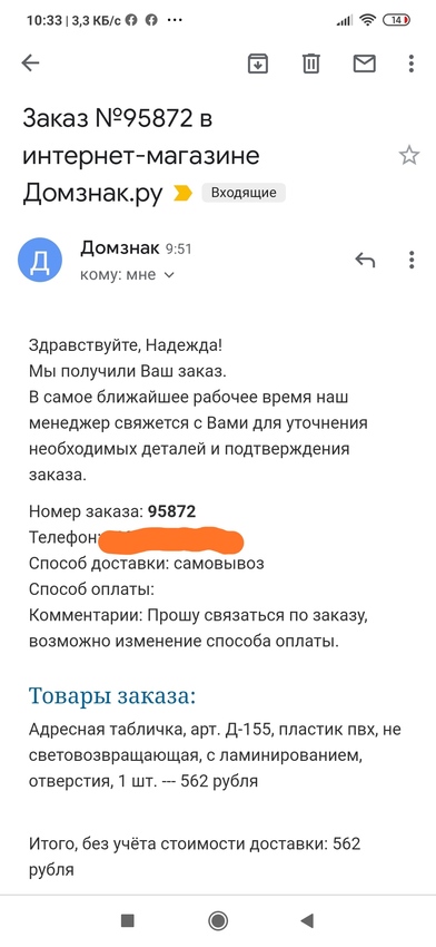 Полный отзыв. Дублирую. По-хитрому скрыта информация о платной доставке из пунктов самовывоза в Москве. На сайте оформляла счет с самовывозом из предложенных пунктов и мне на почту прислали номер заказа с одной суммой. Оператор Юлия уточнила моменты с изготовлением таблички и я решила оплатить не наличными. На почте у меня оказался счет с суммой на 30% больше предыдущего - как мне сказали,- это стоимость доставки в оформленный мной ранее пункт самовывоза и предложили поискать стоимость на сайте. Фраза в первом счете "без учета стоимости доставки" только подтверждает намеренное желание меня ... Весь отзывобмануть. Если бы не хотели, указали бы полную информацию при оформлении мной заказа на сайте. Это очевидно. Кроме того, начальник отдела менеджеров, услышав от меня, что я собираюсь записывать разговор, моментально бросила трубку. Считаю это признанием неспособности ответить за ситуацию. Считаю, что, офрмленный мной через интернет, заказ компании Домзнак не нес полную информацию. Придется попросить Роспотребнадзор проверить данную организацию. Так как через сайт оформляется заказ на одну сумму, а на почту приходит счет на оплату этого же номера заказа без изменений - с другой, более высокой. Во вложении - подтверждение.