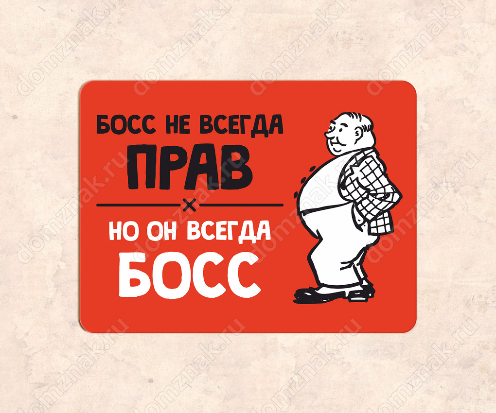 Табличка «Босс не всегда прав, но он всегда босс» изготовлена из пластика ПВХ, толщиной 4 мм. Изображение наносится по технологии УФ-печати. Табличка предназначена для использования как в помещении, так и на улице.