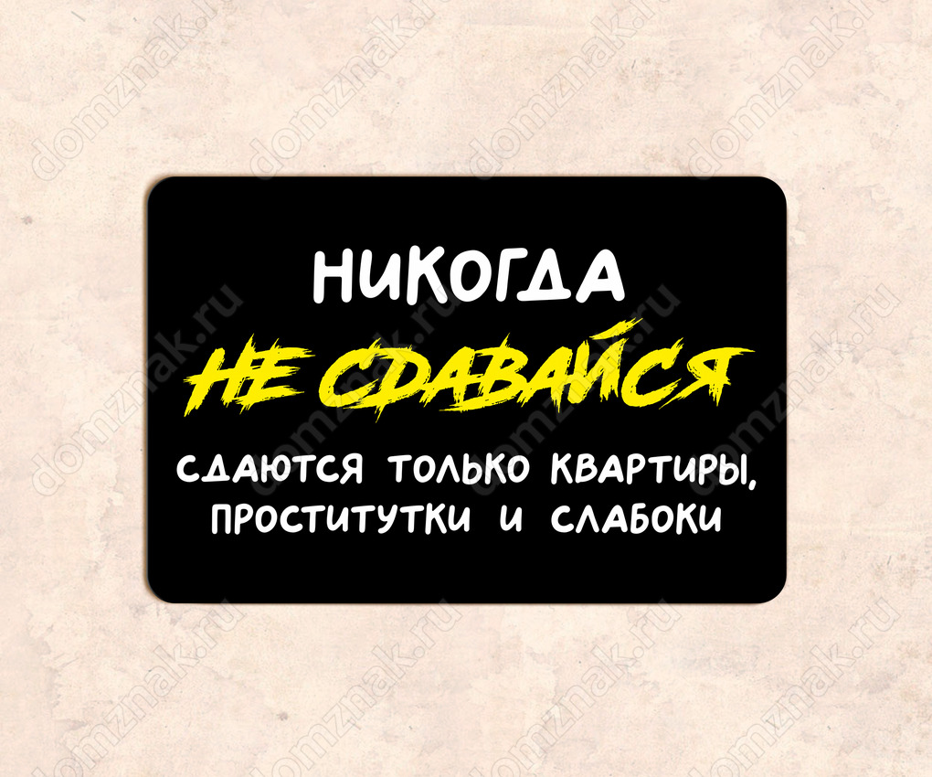 Табличка «Никогда не сдавайся сдаются только квартиры, проститутки и и слабоки» изготовлена из пластика ПВХ, толщиной 4 мм. Изображение наносится по технологии УФ-печати. Табличка предназначена для использования как в помещении, так и на улице.